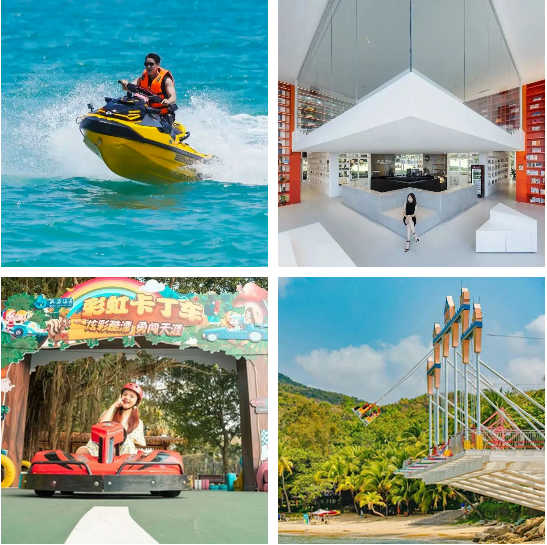 在景区内部还建成了被誉为海南最美书店之一的天涯书局,并增设了天涯飞跃、彩虹秋千、卡丁车等项目,为游客沉浸式游玩提供更多选择。除此以外,天涯海角西区的西部天涯海洋运动俱乐部通过“网红文化+旅游+水上运动”的创新发展模式,打造海南高端水上运动目的地,为游客体验高品质水上运动提供新去处,成为三亚旅游崭新的游玩地标。