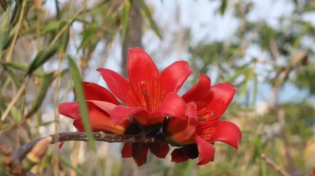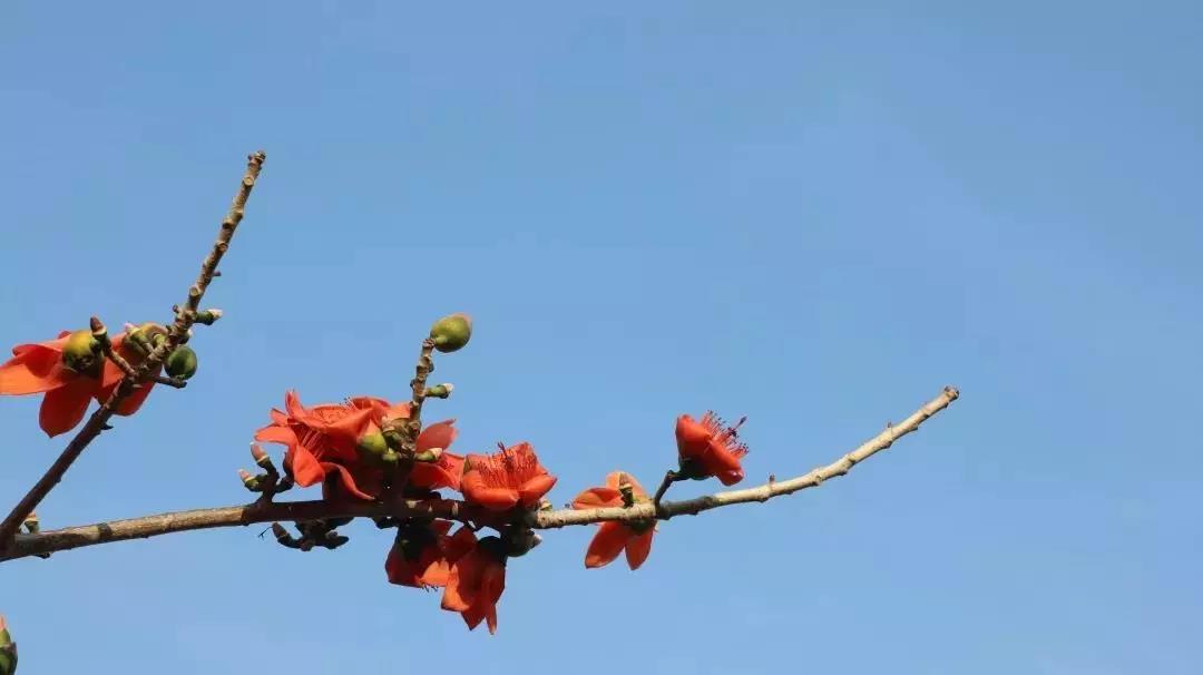 木棉花开了,夕阳霞光照,叶绿影参差,挺拔的棕褐色枝干上绽放着一朵又一朵的木棉花,仿佛一个个火红的小太阳温暖的照耀着人间。