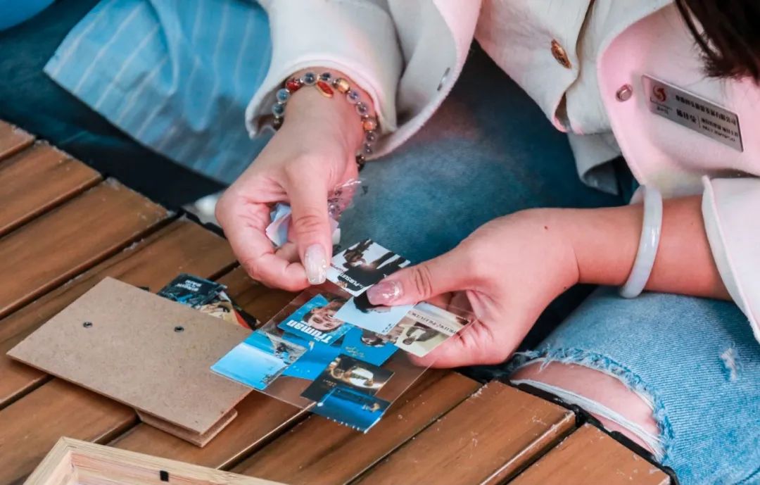 现场提供电影海报贴纸、木质画框、剪刀、胶水等道具。市民游客们可将喜欢的电影场景或海报通过裁剪的方式进行制作。