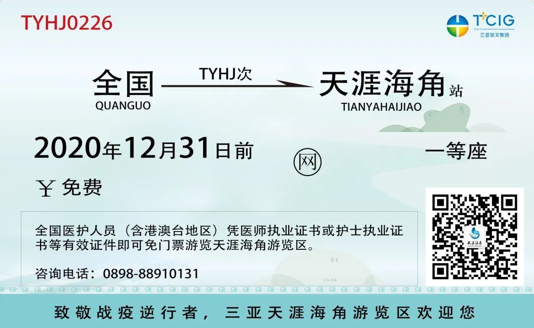 天涯海角游览区自恢复运营之日起至2020年12月31日止,全国医护人员(含港澳台地区)凭医师执业证书或护士执业证书等有效证件不仅可免费入园,还能以5折优惠体验景区内观光快艇、动感飞艇和沙滩摩托车项目。