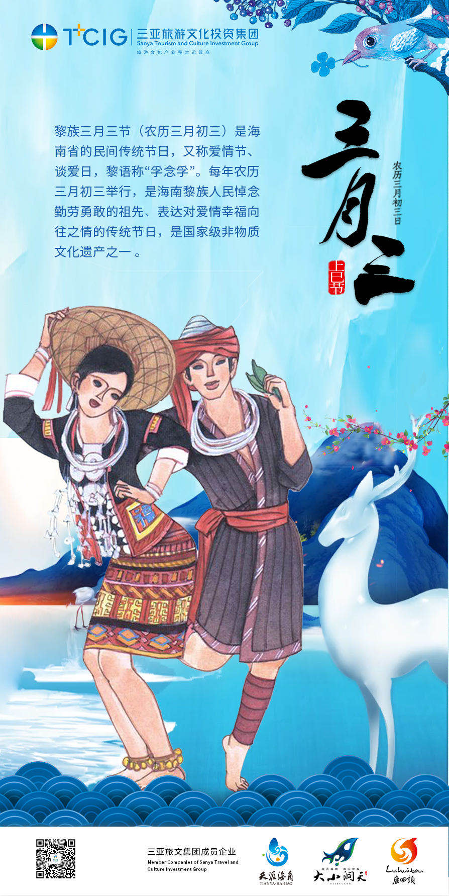 三月三节(农历三月初三),海南省的民间传统节日,又称爱情节、放假日。节日当天,鹿回头风景区推出:海南省黎、苗族同胞,凭身份证免门票入园活动。