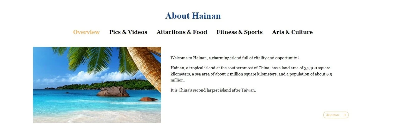 进入网站,页面布局清晰,内容丰富。记者注意到,除了发布即时资讯,展示贸易投资、税收金融政策,英文网站功能设计十分人性化,比如“关于海南”板块通过文字、图片、视频等多种形式,介绍海南的美食风景、艺术和文化,以及健身、运动等信息,让大家更好地了解海南;“商务”板块设置了“直通园区”“办事大厅”“省级机构联系方式”等子板块;“旅游贴士”板块贴心地设置了免签政策、医疗服务和交通服务等子板块,尽可能为海内外人士提供丰富的实用信息。