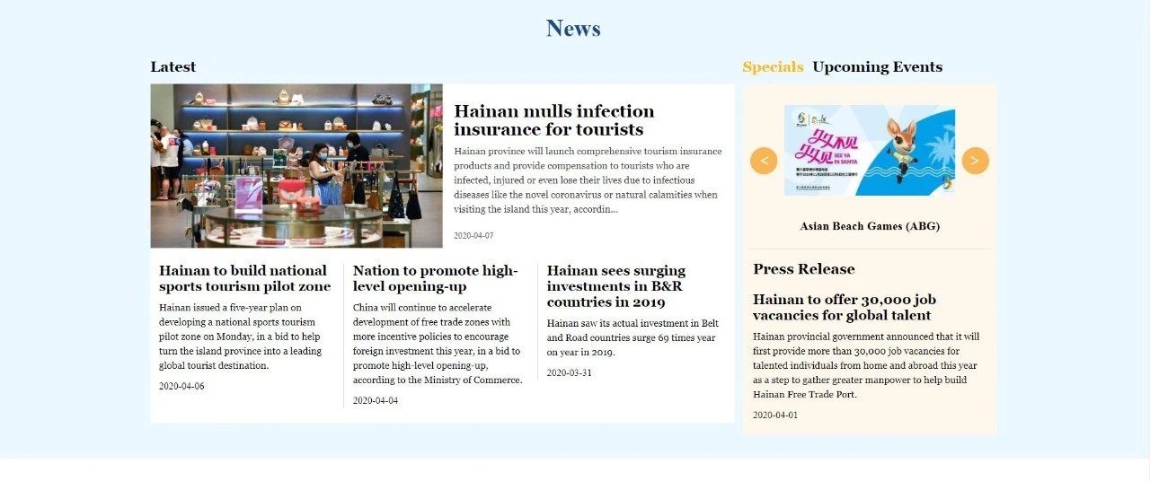 该网站设置了新闻资讯(News)、关于海南(About Hainan)、核心政策(Key Policies)、商务(Business)、旅游贴士(Travels Tips)等多个功能板块,多角度、全方位对外宣传海南岛、推介自由贸易港,为全球访问者打造深入了解海南,特别是了解海南自由贸易港优惠政策、寻找发展机遇的重要平台。