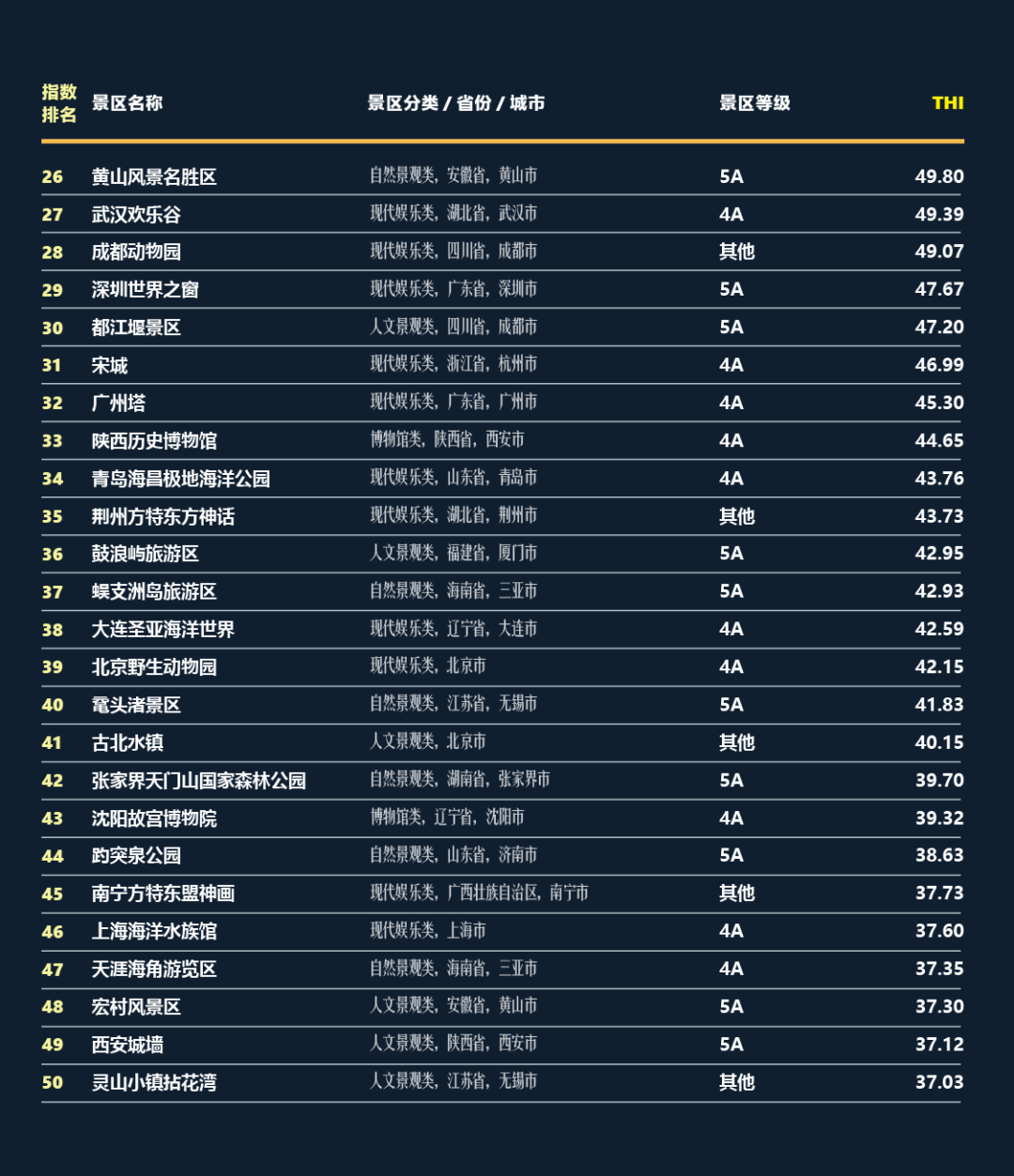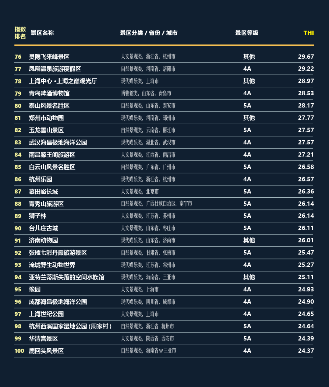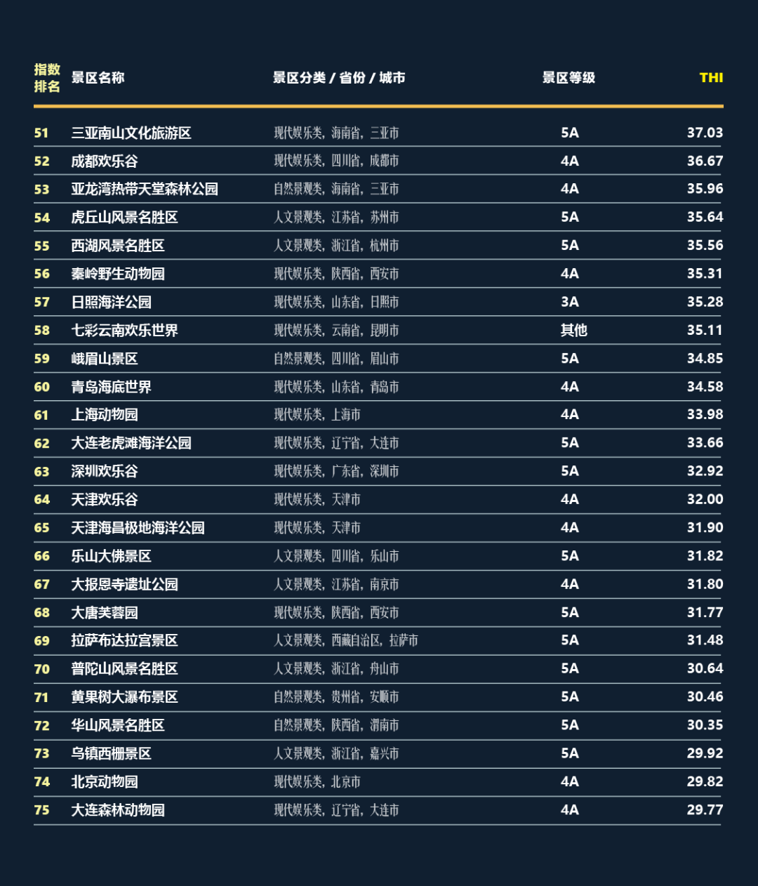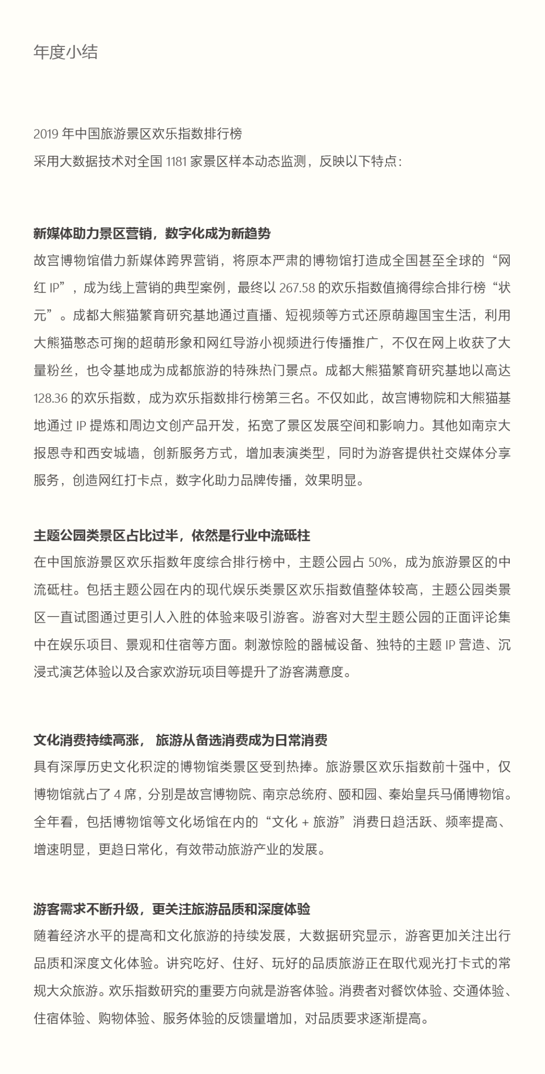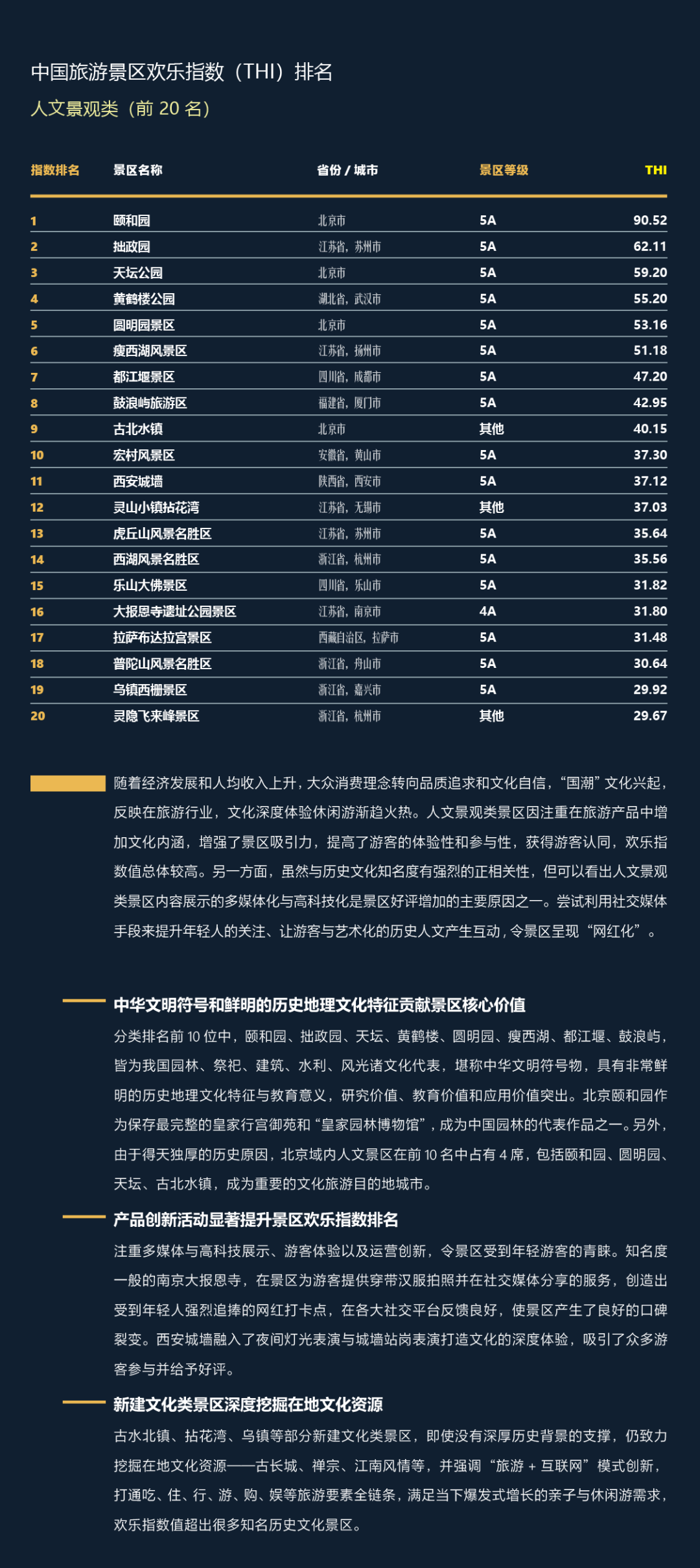 中国旅游景区欢乐指数(THI)研究密切对接市场和游客需求,研判“互联网+旅游”的新趋势。该研究利用新技术整合碎片化数据,协助景区加强智慧化管理运营,有效提升文旅企业的服务水平和经营效能。据悉,未来中国旅游景区欢乐指数研究(THI)将继续深入,扩大研究样本,丰富研究内容,形成更加综合性的欢乐指数研究报告。同时继续深挖旅游大数据蕴藏价值,以此研究为基础,拓展指数研究范围,搭建涵盖中国旅游景区评判标准的复合指数体系。