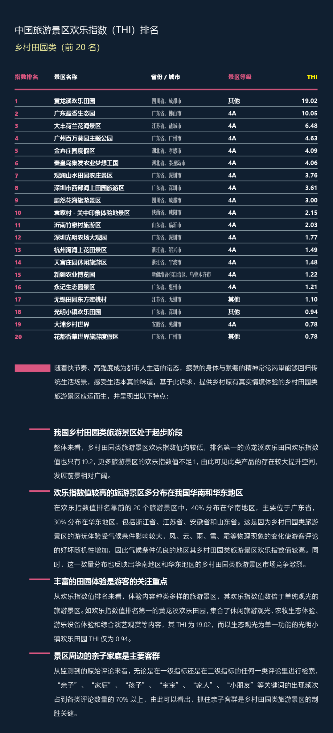 4月20日,由中国旅游景区协会和华侨城创新研究院联合研发编制的“中国旅游景区欢乐指数指数(THI)研究报告及排名”正式发布,定位于打造公正、科学的具有社会影响力和行业指导性的旅游指数体系,基于旅游大数据的应用,以公正、客观原则对游客的综合体验评论进行量化科学分析,反映中国旅游行业发展的时代特征。该指数产品既有助于景区运营,也为游客出行提供了有价值的参考。据悉,“欢乐指数”及排名在全国旅游行业属于首创,核心算法已在国家知识产权局申请了专利。
