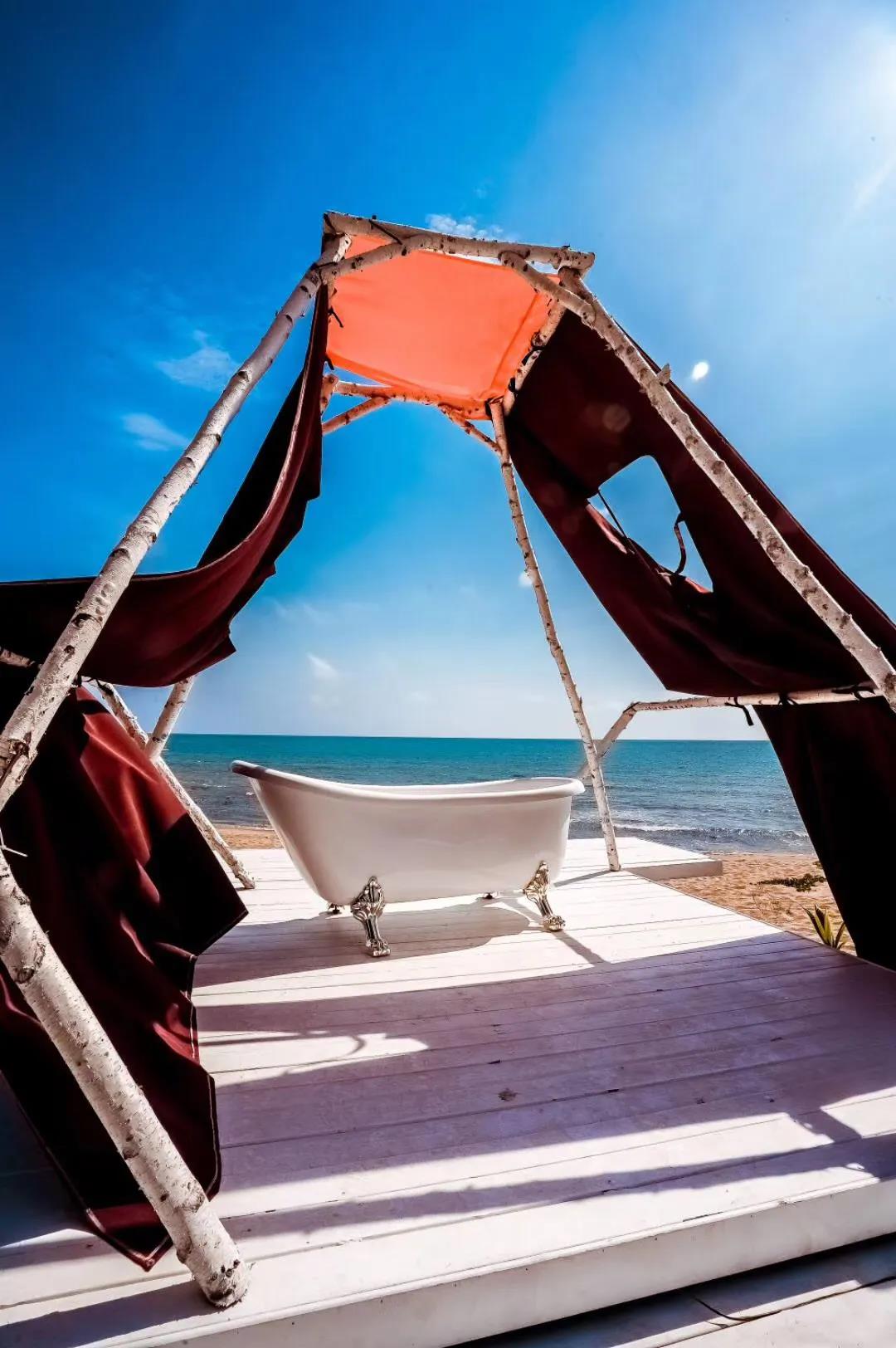 用玻璃墙面和地面映衬出天蓝海湛,既温馨又浪漫