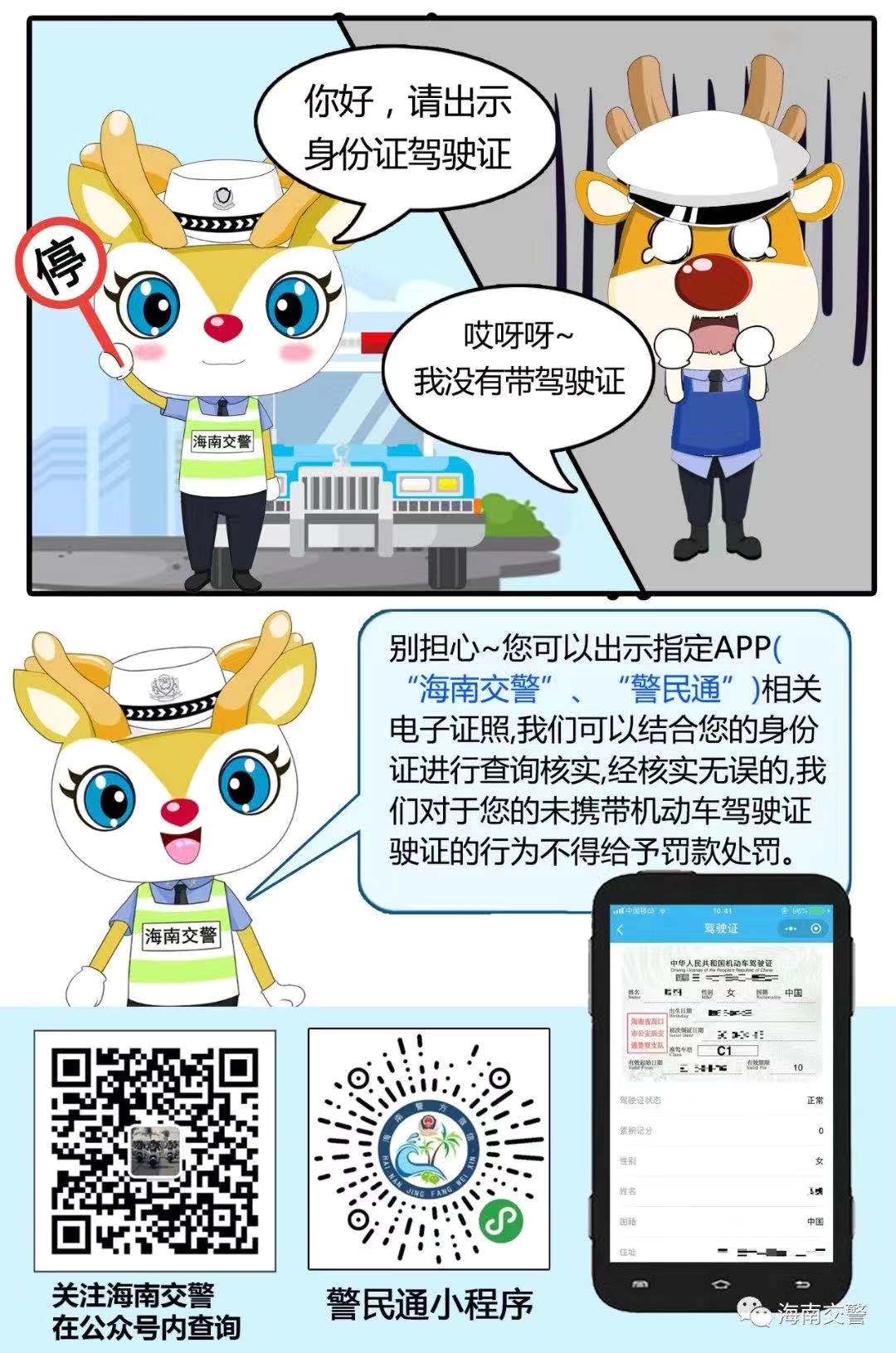 为进一步提升海南公安交管便民服务水平,海南公安交警总队决定从即日起,在“海南交警”微信公众号和“警民通”等手机APP上线机动车驾驶证、行驶证电子凭证(以下简称“电子证照”)。