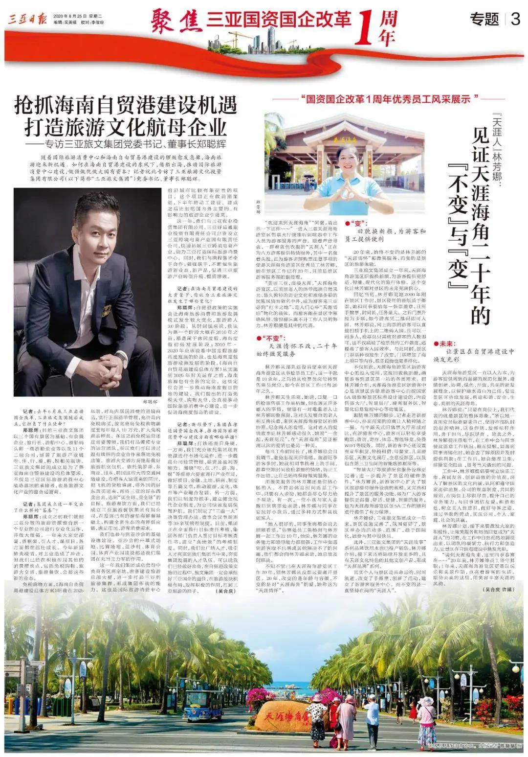 郑聪辉:打铁还需自身硬。一方面,我们充分依托集团现有资源进行市场化运作,进一步提高公司经营管理、融资及盈利等能力。围绕“吃、住、行、游、购、娱”等旅游六要素进行产业布局,做好项目、金融、土地、招商、制度等五篇文章,推动旅游、文化、体育等产业融合发展。另一方面,我们以制度为抓手,建立健全现代企业制度,为公司快速发展保驾护航。我们制定了“三重一大”决策管理办法、董事会议事规则等30余项管理制度。目前,集团正在全面推行目标责任考核,集团各部门负责人签订目标考核责任书,建立“真绩效”的考核制度。同时,我们也广纳人才,吸引人才充实到我们集团当中来,夯实集团发展的人才队伍。可以说我们已经做好准备,在自贸港政策实施的过程中,旅文集团一定会承担好三亚国企的重任,在旅游版块积极布局,发挥积极的作用,扛起三亚旅游的担子。