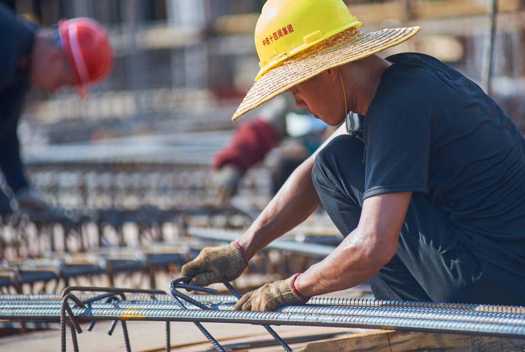 工人进行钢筋绑扎搭建工作