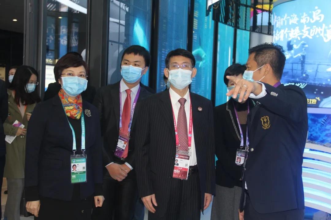 海南省副省长沈丹阳,三亚市委常委、副市长谭萍参观三亚旅文集团展位并亲切了解情况,三亚旅文集团党委书记、董事长郑聪辉陪同介绍。